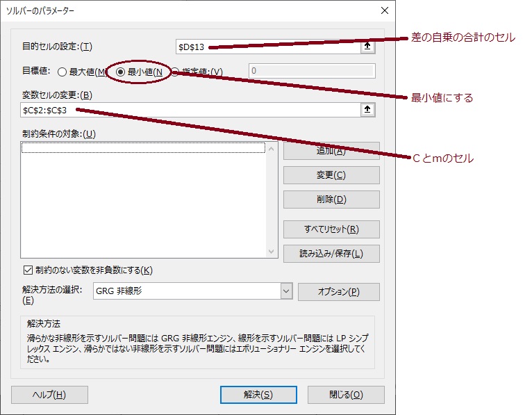 ⑥ソルバー機能を使って,「差の自乗」の合計が最小となるようなCとmを求めます。ソルバーの画面を図13に示します。図12のエクセルシートは,ここからダウンロードできます。