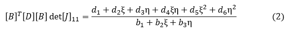 積分点を1点(n=1)とした場合を低減積分要素,4点(n=2)とした場合を完全積分要素といいます。[B]T[D][B]det[J]11は,有限要素法の定式化のページで導出したように以下の形をしており,分子だけに注目すればξ,ηの2次式なのでn=2で厳密な定積分ができるのですが,分母がξ,ηの1次なのでnをいくらにしても厳密な定積分を行えるわけではありません。しかしn=2の場合を完全積分と言っています。「完全」とは少し言いすぎですね。